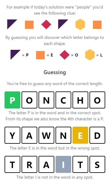 Polygonle is a word puzzle game where your task is to decipher a hidden word. At the beginning of the game, you will see a sequence of polygons, the number of which is equal to the length of the word. Similar polygons mean the same letters, so you should put the same letters in places with the same polygons, and different letters in places with different ones. Follow the color prompts to guess the daily Polygonle in six tries!